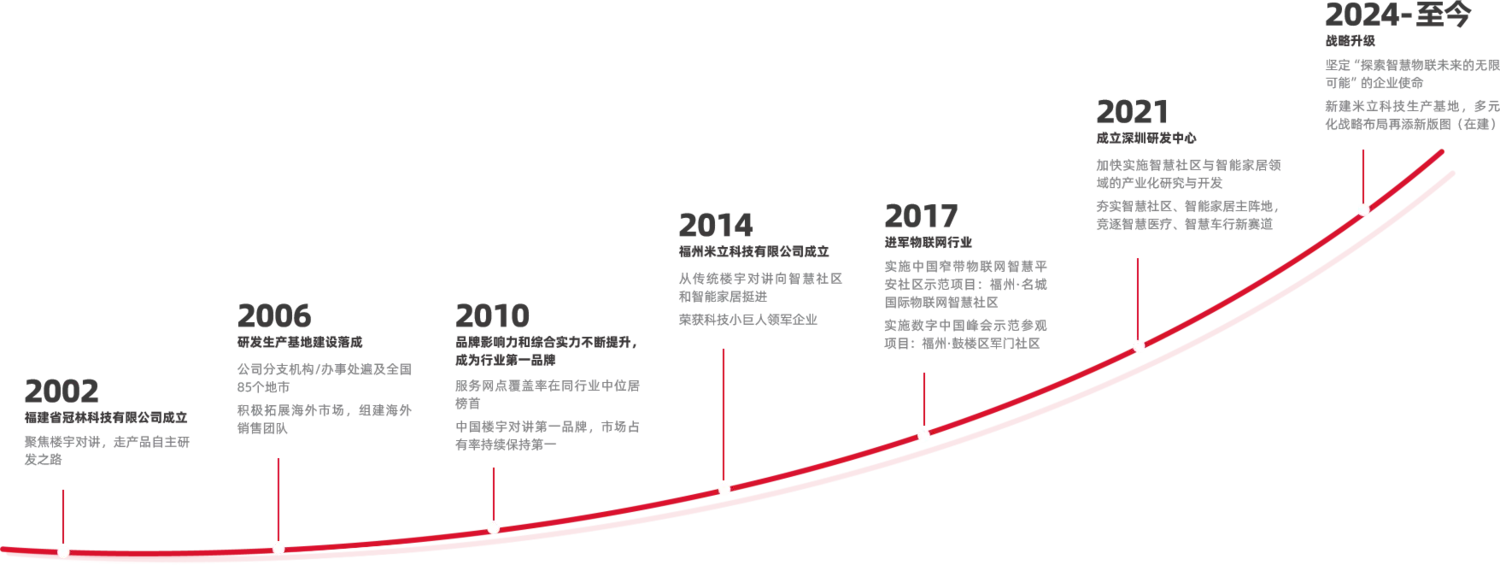 福州米立科技股份有限公司,是一家集研发、生产、销售和服务为一体的高新技术企业。自成立以来,米立以“探索智慧物联未来的无限可能”为使命,致力于成为业界领先的物联网智能产品提供商。米立与冠林系公司旗下双品牌,专为智能楼宇及住宅、园区、医院等提供智能化产品及方案,业务涵盖智慧通行、智能家居、智慧医疗、智慧车行等多个领域。历经多年发展,公司已在全国主要城市及地区设立分支机构和办事机构,为客户提供及时、可靠的本地化服务。未来,公司将始终秉持“诚信·共赢”的经营之道,携手生态伙伴,共推行业发展,共创美好未来。